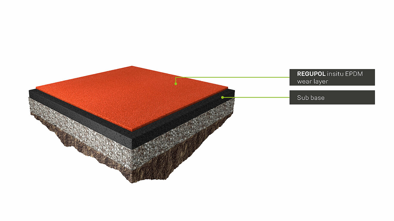 Our REGUPOL technicians install the single-layer playing field surface on an asphalt base layer using the in-situ installation method. The high-quality components are mixed on site and applied to the sub-base using special machines and techniques. You like things to be colourful? No problem: there are plenty of colours to choose from. Our REGUPOL technicians will also apply the desired pitch lines and markings for you. We are at home in sports floor construction. Customers from all over the world place their trust in us.