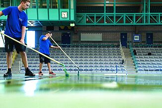 This is when REGUPOL dynamic SR comes into play. This innovative sports-hall flooring system got all the required properties of a traditional sports-hall floor. It is point elastic, provides good shock absorption, is seamless and got a smooth surface that is ideal for all ball games as well as floor gymnastics for instance. However, due to its extraordinary polyurethane wearing surface it is spike proof according to DIN 18 035. All common school-sport activities as well as the 60 m sprints with spiked shoes can be held without a problem. Further, the runners that use the 200 m track do not have to worry about damaging the sports-hall floor when getting off the track.