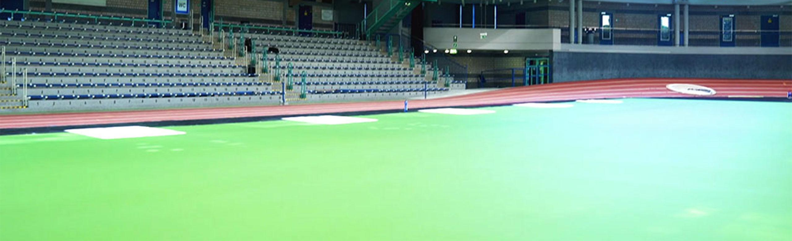 As the runners do wear spiked-shoes also during their indoor training, the entire sports-hall floor must be spike resistant. A typical indoor sports-hall floor cannot fulfil this requirement, as spikes would destroy the wearing surface.