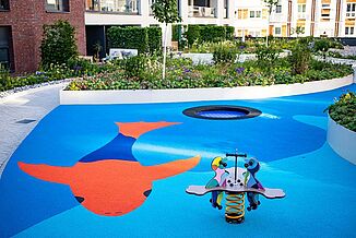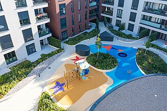 In densely built-up cities, space for play areas is often at a premium. However, to make sure the younger and youngest residents of Hansehof Quarter A11 also feel at home, the inner courtyard area between the residential buildings was used to create an imaginative playground with quick and easy access for all residents and their children. What’s special about this playground is that it’s built on the top of the complex’s underground garage.