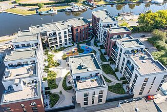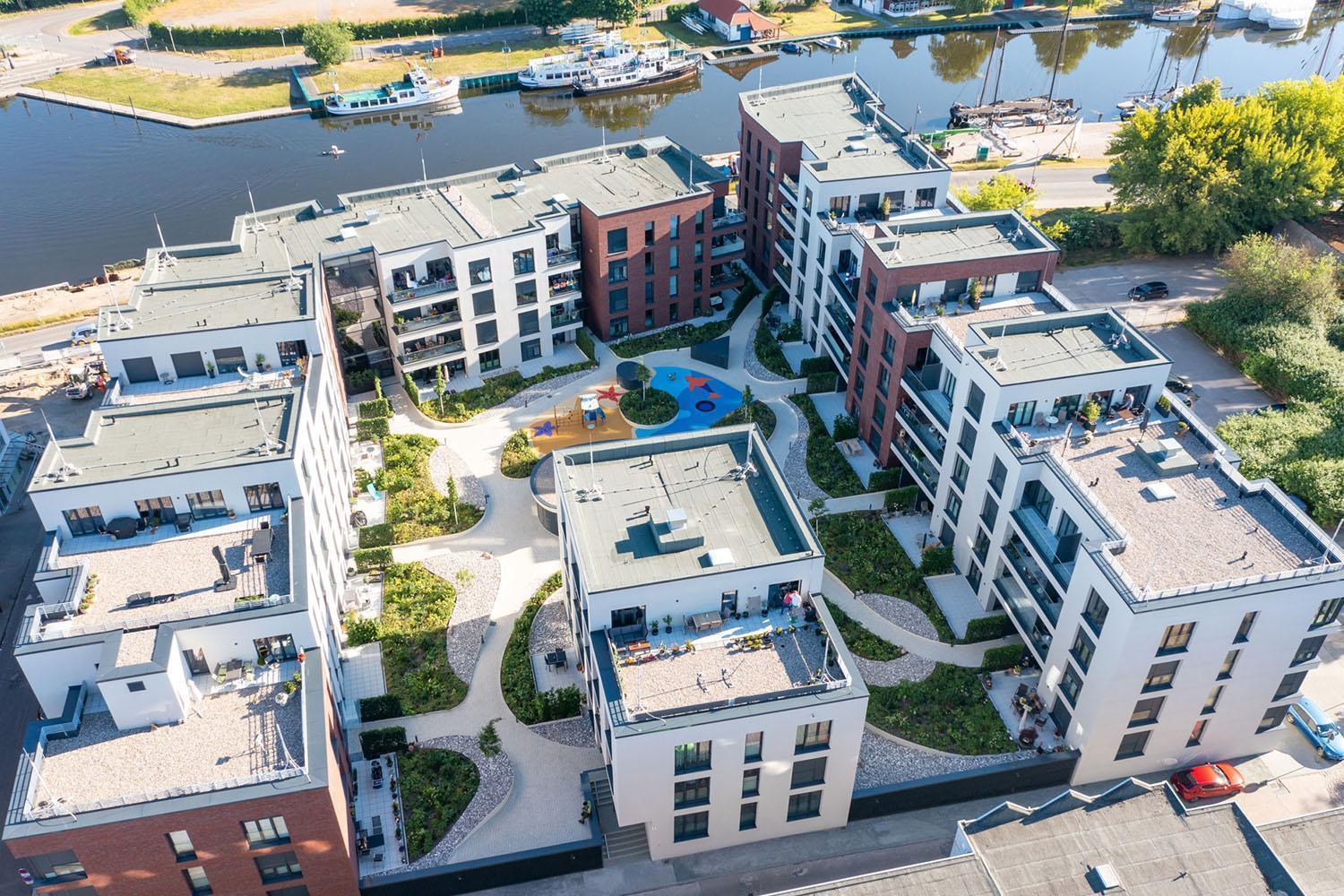 In the university and Hanseatic city of Greifswald, a new construction project has been completed in the town centre, directly on the river Ryck. The new residential quarter is closed on three sides and contains 10 residential buildings, 96 apartments and 105 parking spaces, including an underground garage.