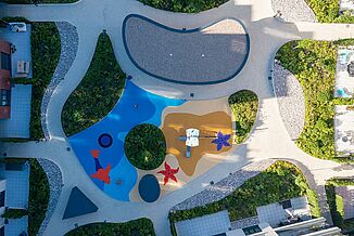 The REGUPOL playfix fun safety floor has an unlimited design potential. The safety surface installed in Greifswald, for instance, is a mixture nine different design colours (Capri blue, rainbow blue, teal, beige, eggshell, orange, slate grey, rosé and violet). The blue sea and the sandy beach – including fish and sea stars – encourage the children to dive into their own world of pure fantasy.