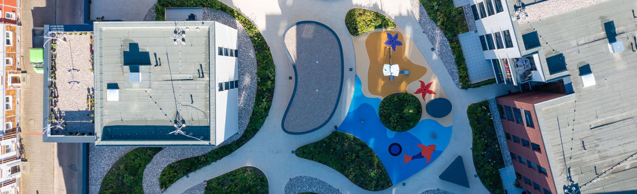REGUPOL carried out the installation of the safety floor, together with the client, landscape gardeners “Gartenprofi Wuttig Landschaftsbau GbR” and the landscape architect Olaf Petters. “For us, this project was something special, because our material had to be delivered by crane “one floor up” into the courtyard on top of the underground garage. That meant we had to pay attention to bearing loads/roof loads, so that our product design didn’t turn out to be too heavy. But we managed to overcome that challenge as well. This project is just further proof that teamwork is an important priority for us at REGUPOL”, explains Sabine Rehberg (sales representative in the seamless safety floors unit at REGUPOL).