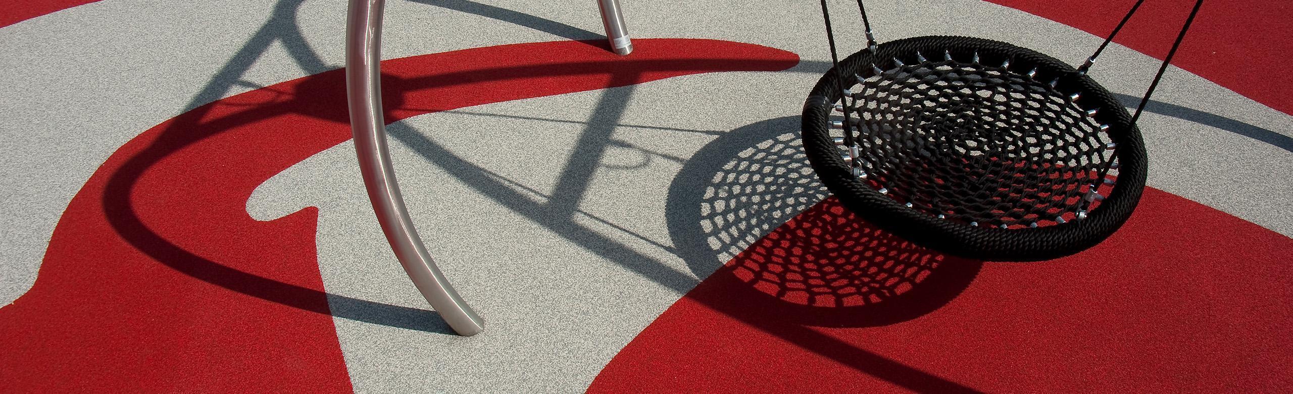 The rectangular play area is approximately 10 to 15 cm lower than the adjacent pathways. 450 sqm. of the playing and movement area were fitted with the REGUPOL playfix fun seamless safety flooring from REGUPOL. The floor surface and the Baroque-style inlays each consist of a mixture of granulate in two colours. “The majestic patterns as well as the discreet colouring of the playing apparatus reflect the design concept perfectly”, says Czerniejewski. “And what’s more, the coloured patterns add to the facility’s play value.”