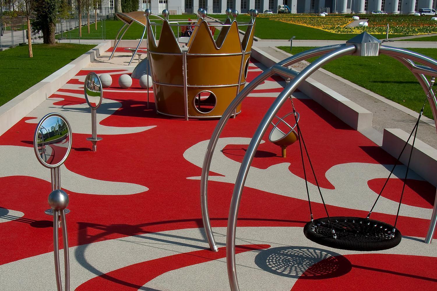 That’s precisely why the landscape architect was very keen to work with a material which, through its composition and installation method, would allow a multi-coloured design. In REGUPOL playfix fun, he found it. The two-layer structure guarantees the required fall protection values and the coloured wear layer places no limits on design creativity. REGUPOL playfix fun closes seamlessly around the integrated play equipment - which was also chosen with the special needs of children with disabilities in mind - creating a child-friendly adventure playground with barrier-free access. A lot of this equipment was specially designed in stainless steel, to prevent any views of the palace and gardens being obscured. As landscape architect Johannes Czerniejewski explained: “The transparency of our playground equipment was very important to us due to the historical surroundings.”