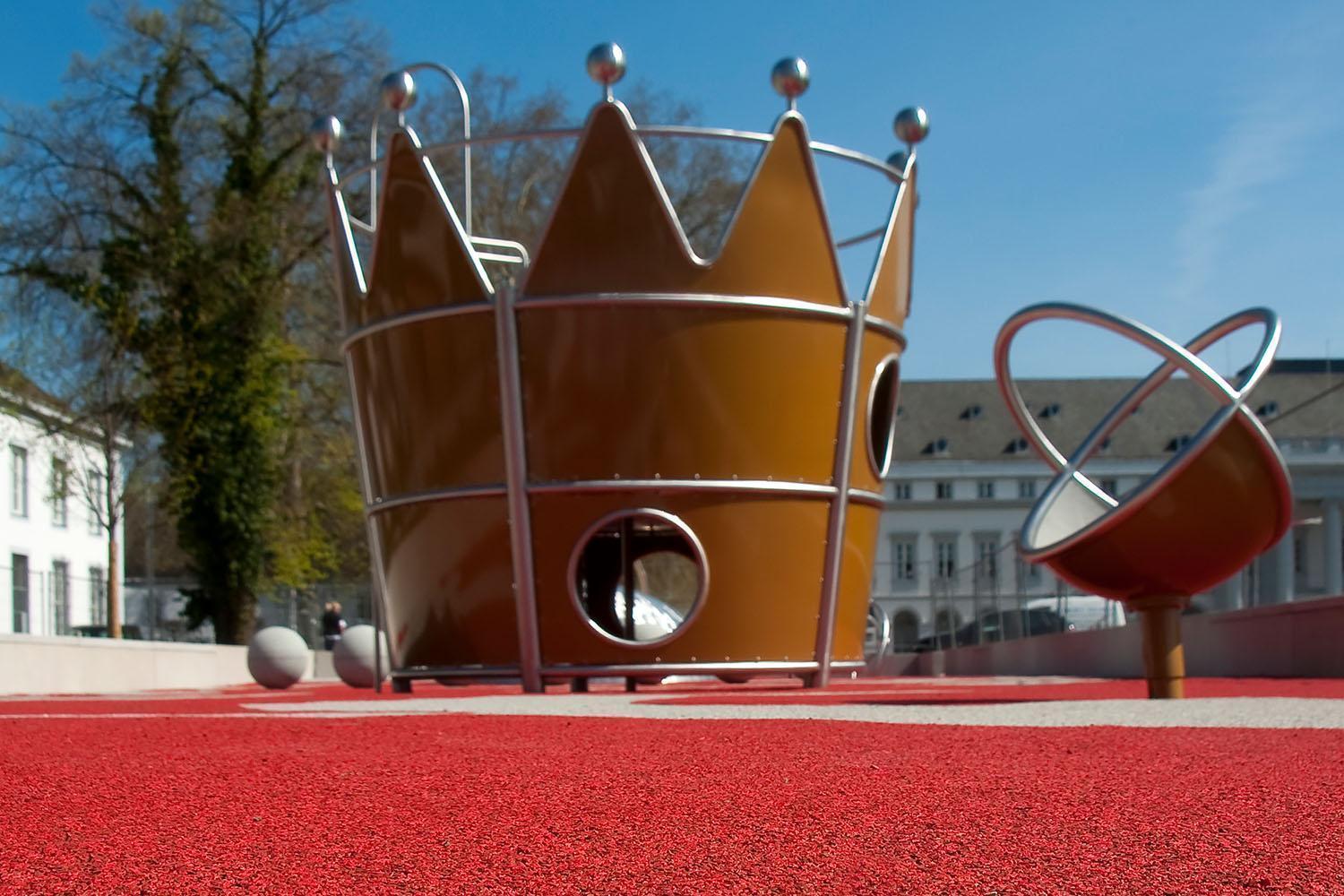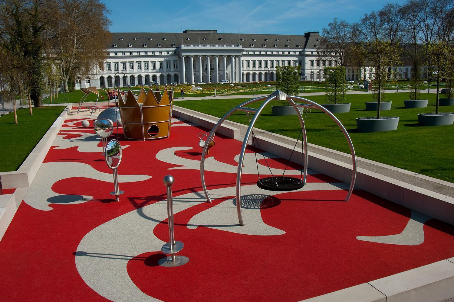 For the play area in the north-west section of the palace forecourt, landscape architect Johannes Czerniejewski (RMP Stephan Lenzen Landscape Architects from Bonn) selected the „Schmuckkästchen der Kaiserin Augusta“ (Empress Augusta’s Jewellery Box) as the overall design concept. The idea, he said, was inspired by the historical ambience and the former German Empress herself, who had had magnificent gardens designed and laid out during her long stay in Koblenz.
