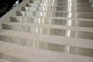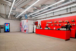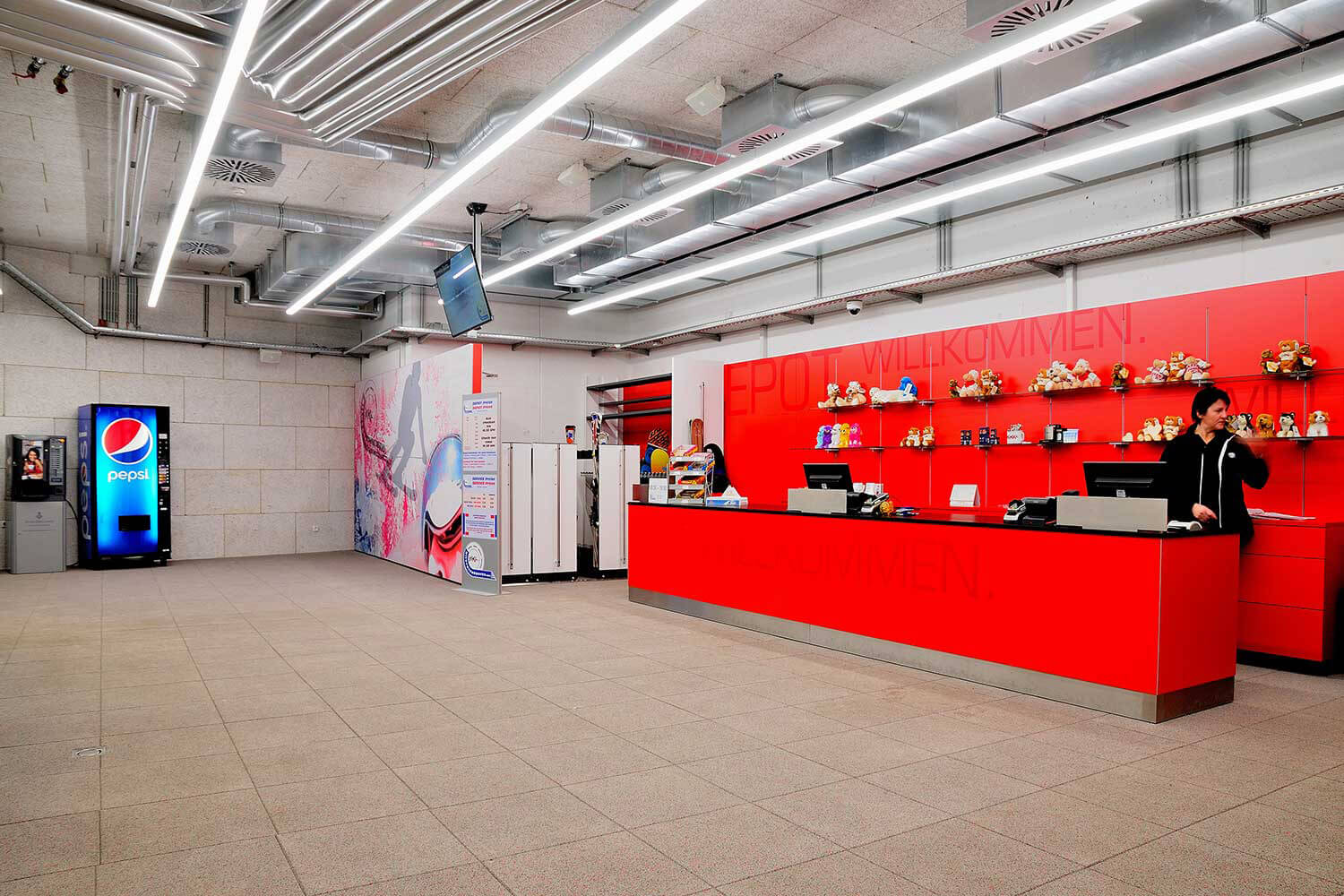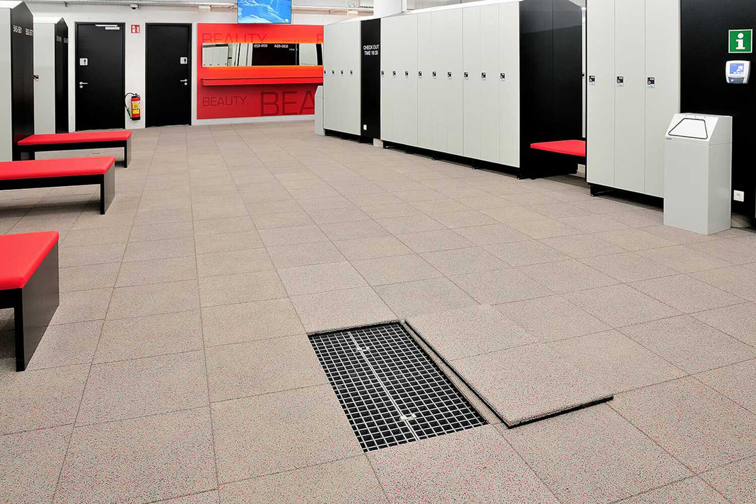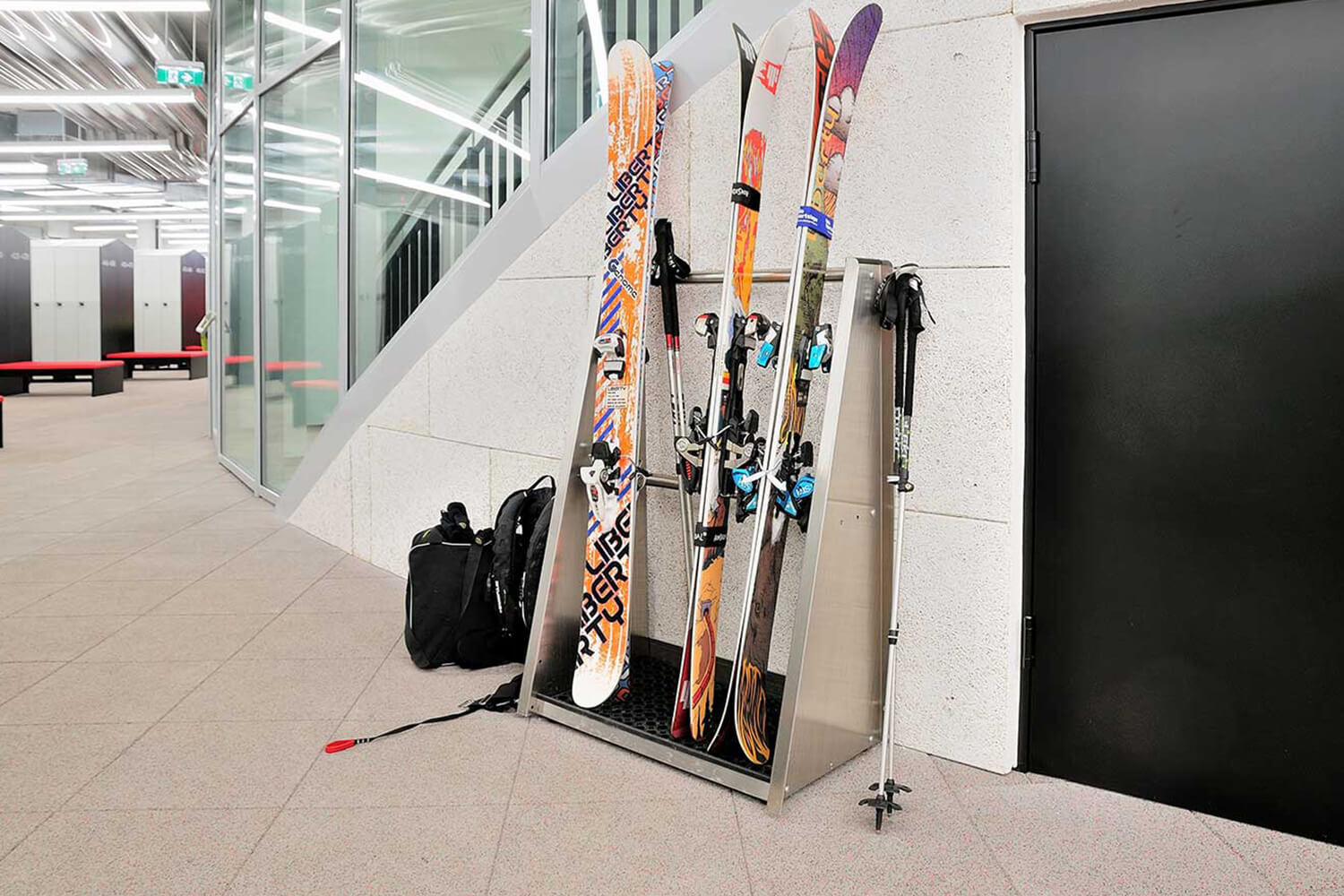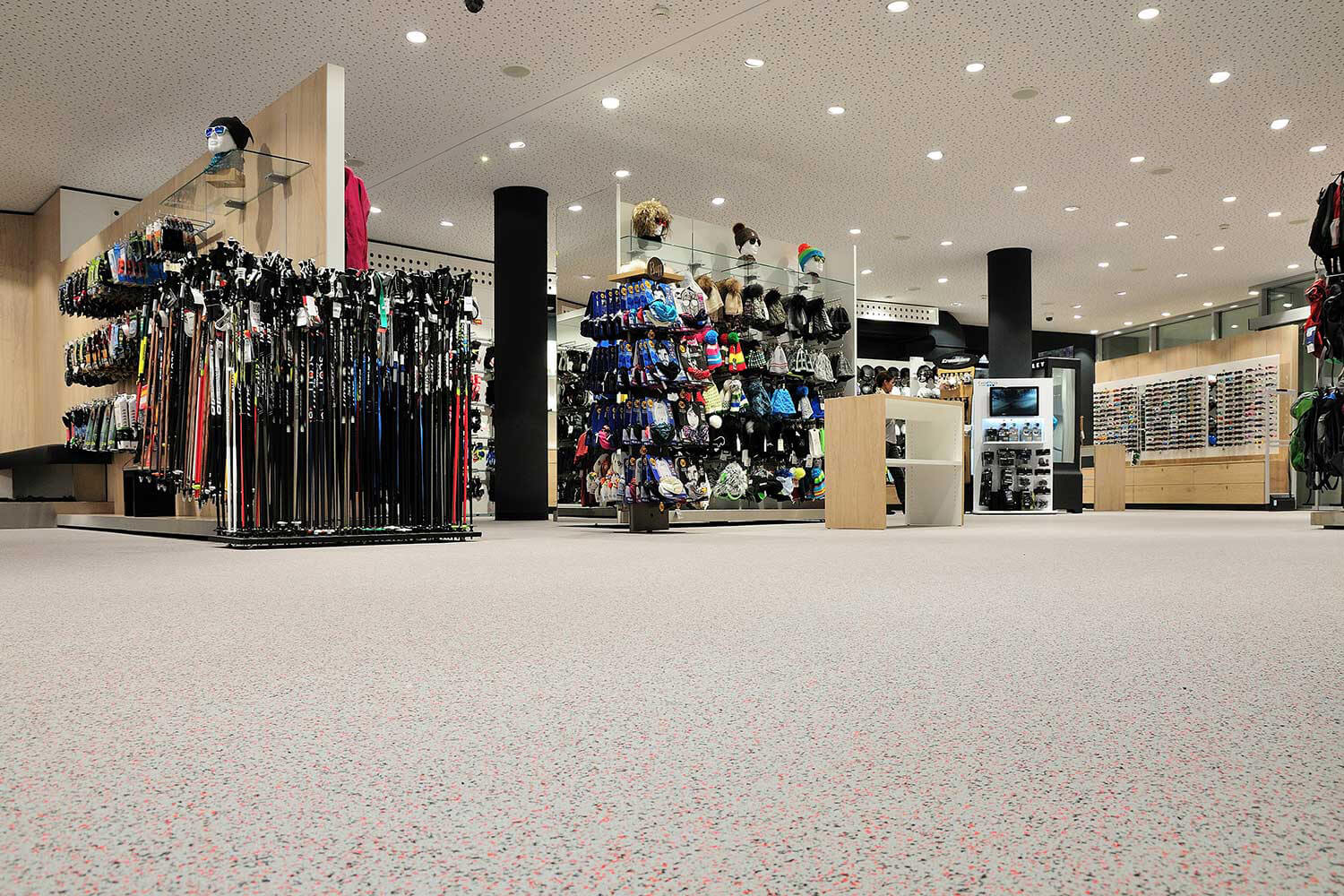 In the approximately 1,100 m² ski depot, REGUPOL everroll alpine EL mycreation Cfl-s1 floor tiles were used especially for the installation of the floor. The two-layer, 1,000 x 500 mm tiles were laid loosely on the GRP grid construction to guarantee that the tiles can be removed easily at any time for maintenance and inspection purposes. The approx. 11 mm thick, highly resilient wear layer is resistant to all usual loads, as well as steel runner blades, ski poles and ski boots, and it is also very lightfast. The PUR-bonded rubber fibres of the soft base layer are very pleasant to walk on. The colour design of the approx. 30 mm thick tiles was created according to the client's wishes and matched with the floor surfaces installed on the other levels.