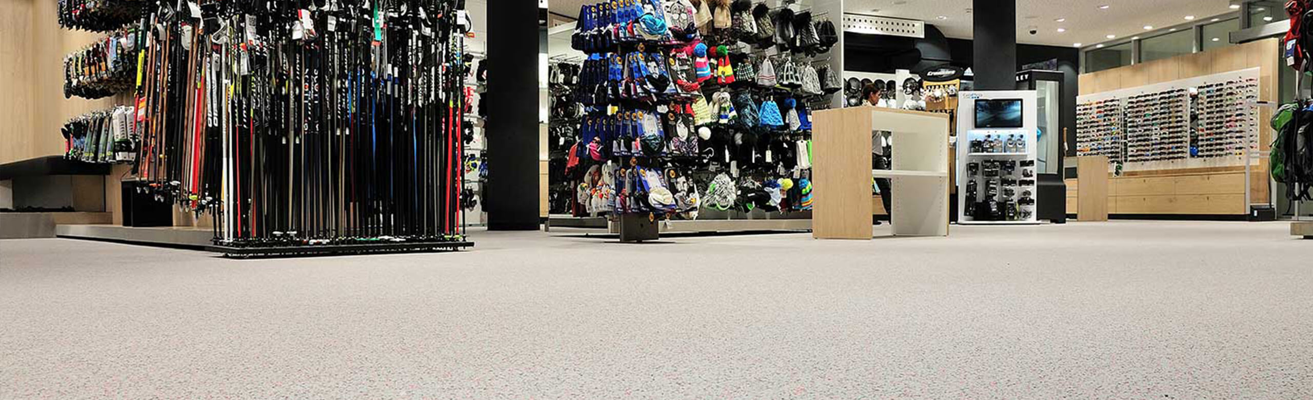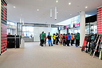 Using the same colour scheme, but with a different finish, approx. 1,300 m² of the boarding level with its sports shop and ski rental, as well as the ticket office area in the valley station, were fitted with REGUPOL everroll alpine mycreation. The 6 mm thick floor covering used here is just as hard-wearing and slip-resistant as REGUPOL everoll alpine EL. Depending on the version, the special elastic floor can also be used on outdoor surfaces around the building.