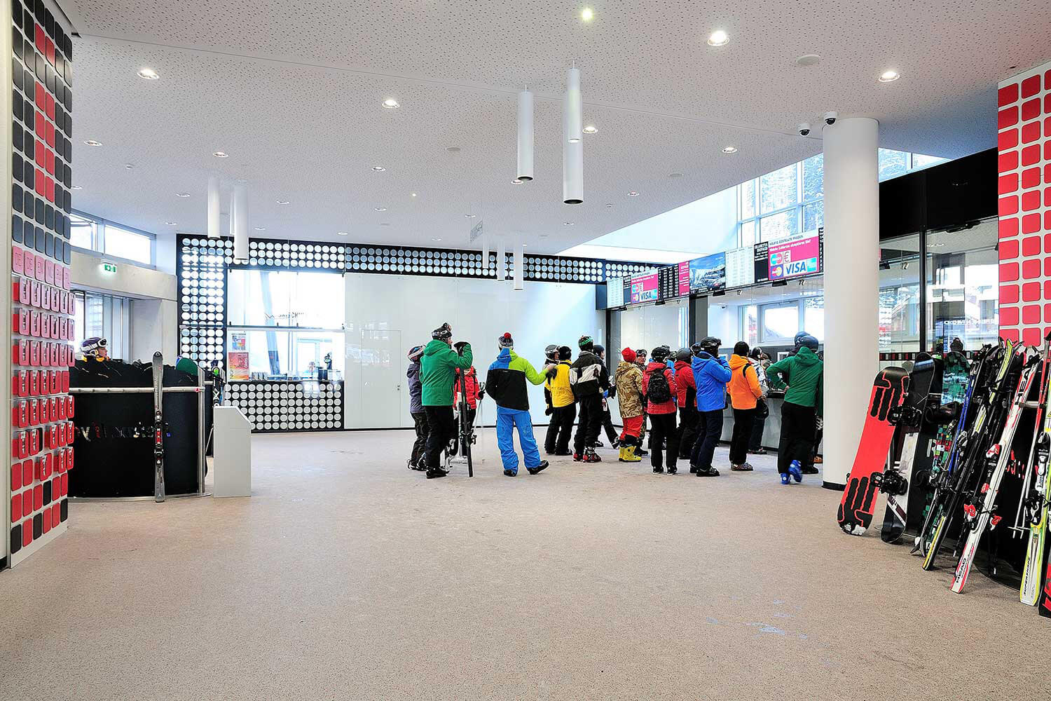 A ski depot and servicing area are located on the lowest level, while a sports shop and the ski rental await visitors on the level above. At ground level is the ticket office with a covered waiting area, while the top level provides access to the cable car.