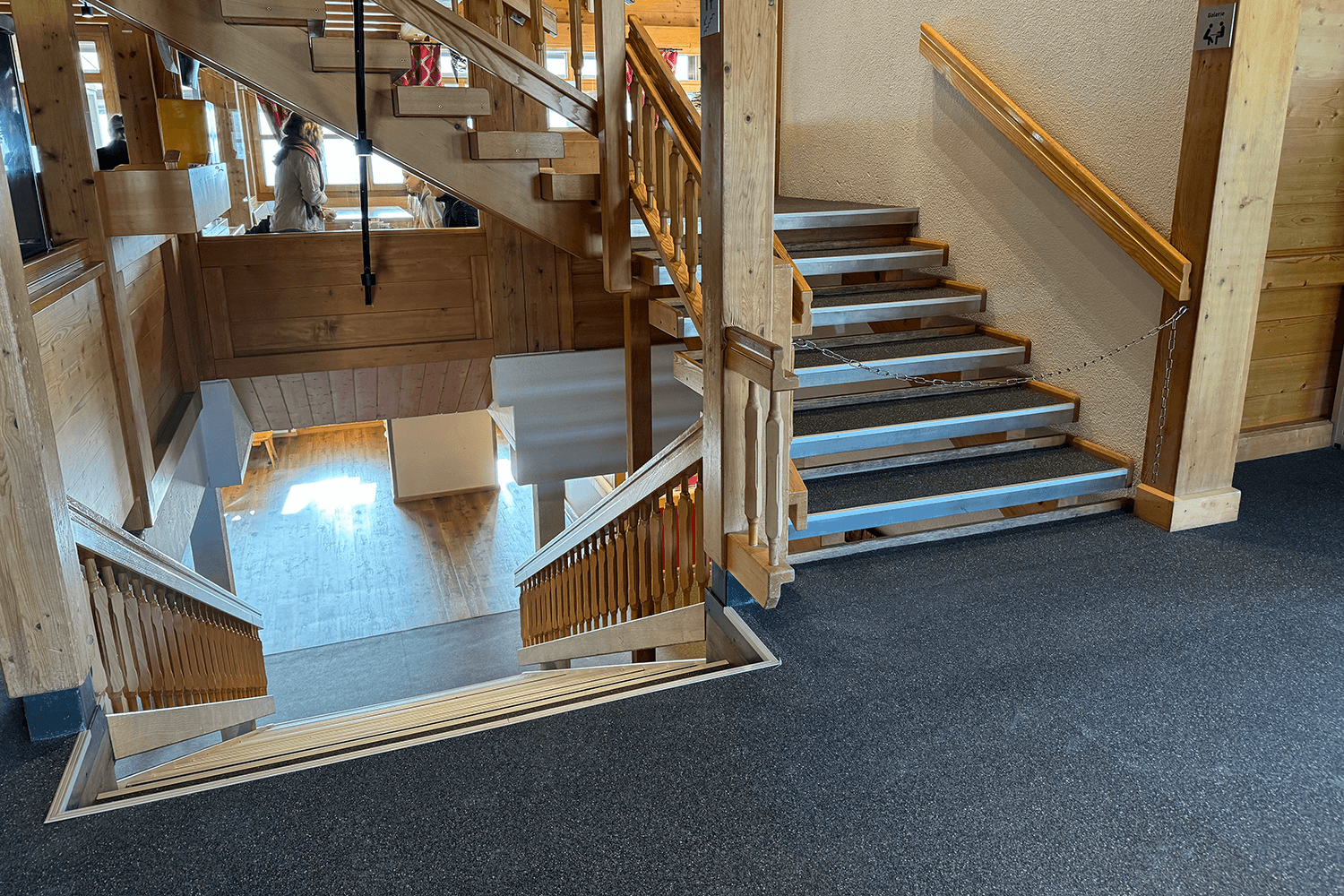 Another special feature of our REGUPOL everroll alpine flooring is that it can be combined with natural materials such as wood and stone. The flooring not only gives the restaurant a modern appearance, but also preserves its traditional mining aesthetic. In addition, our REGUPOL everroll alpine flooring makes the room acoustics very pleasant and significantly reduces walking noise in this very spacious catering outlet. This creates an inviting and stylish atmosphere and is essential in winter, when many people move around the restaurant in their ski boots.