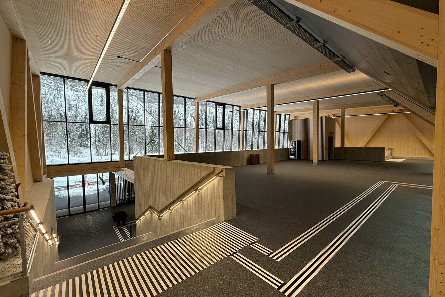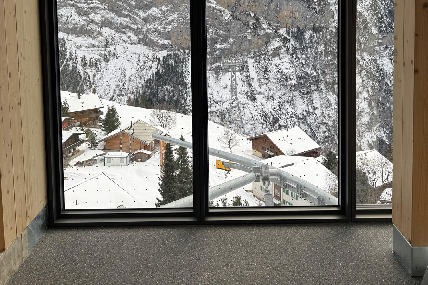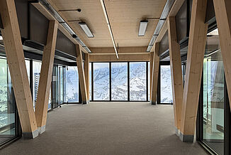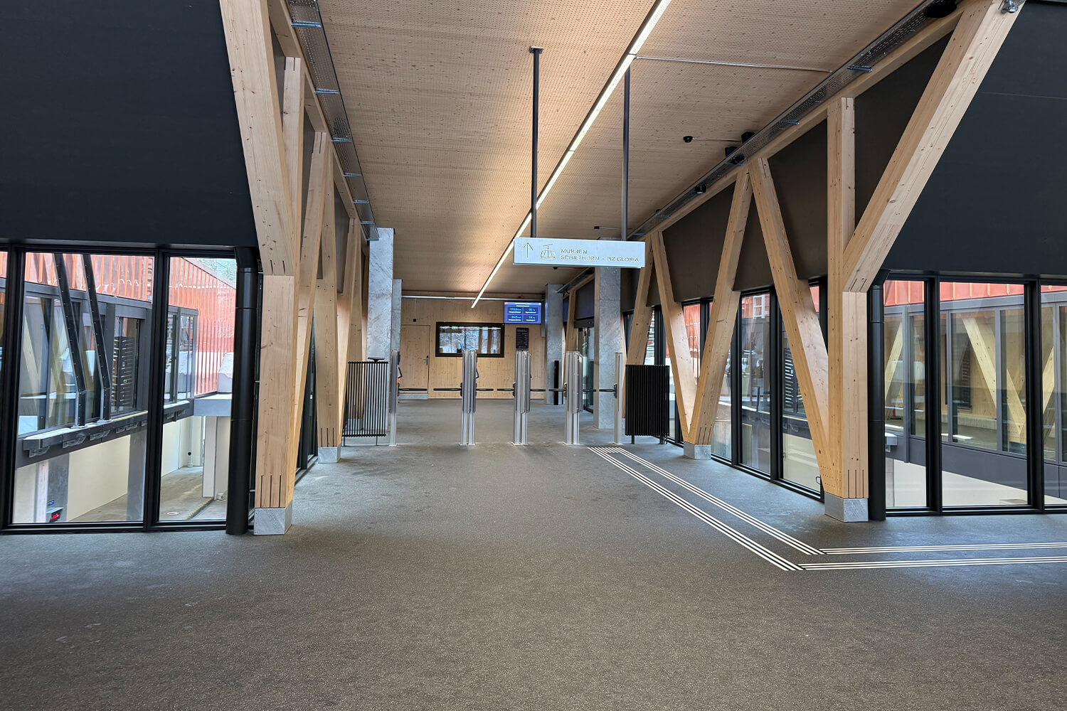 The Schilthornbahn not only takes guests to their destination, but also provides an impressive experience along the way. As you glide upwards in the world's steepest cable car, a panoramic view opens up that is well worth seeing. This is why many glass fronts have been installed in the various stations. The REGUPOL everroll alpine floor is timeless, allowing the surroundings to shine even more. The wood materials used, for example for wall panelling, columns or benches, harmonise very well with the floor covering in the trendy colour grey.