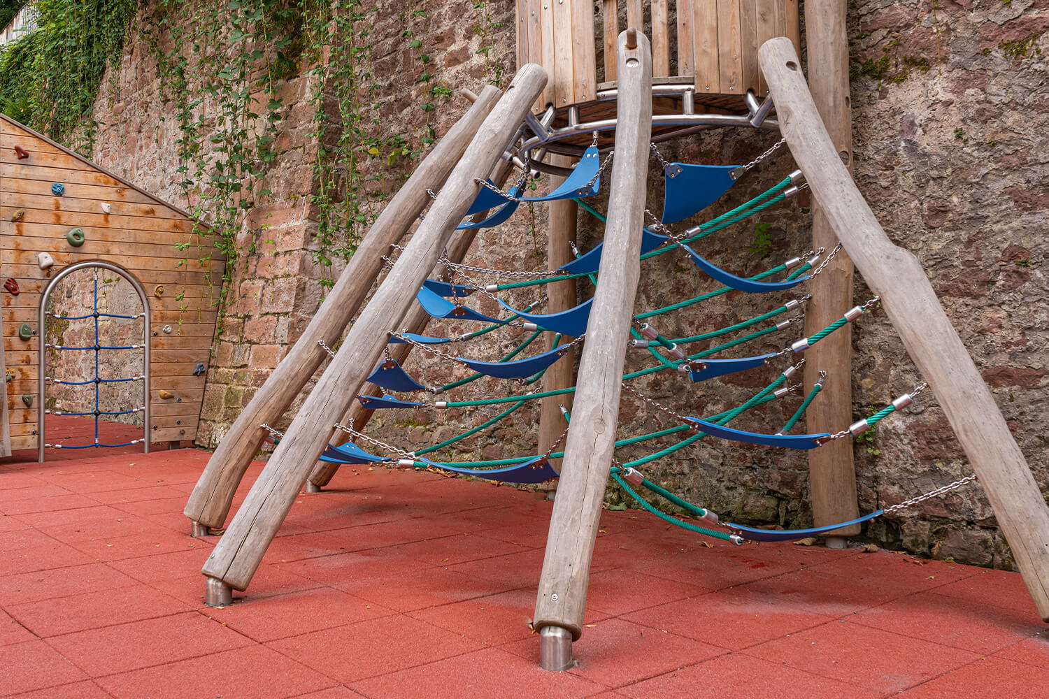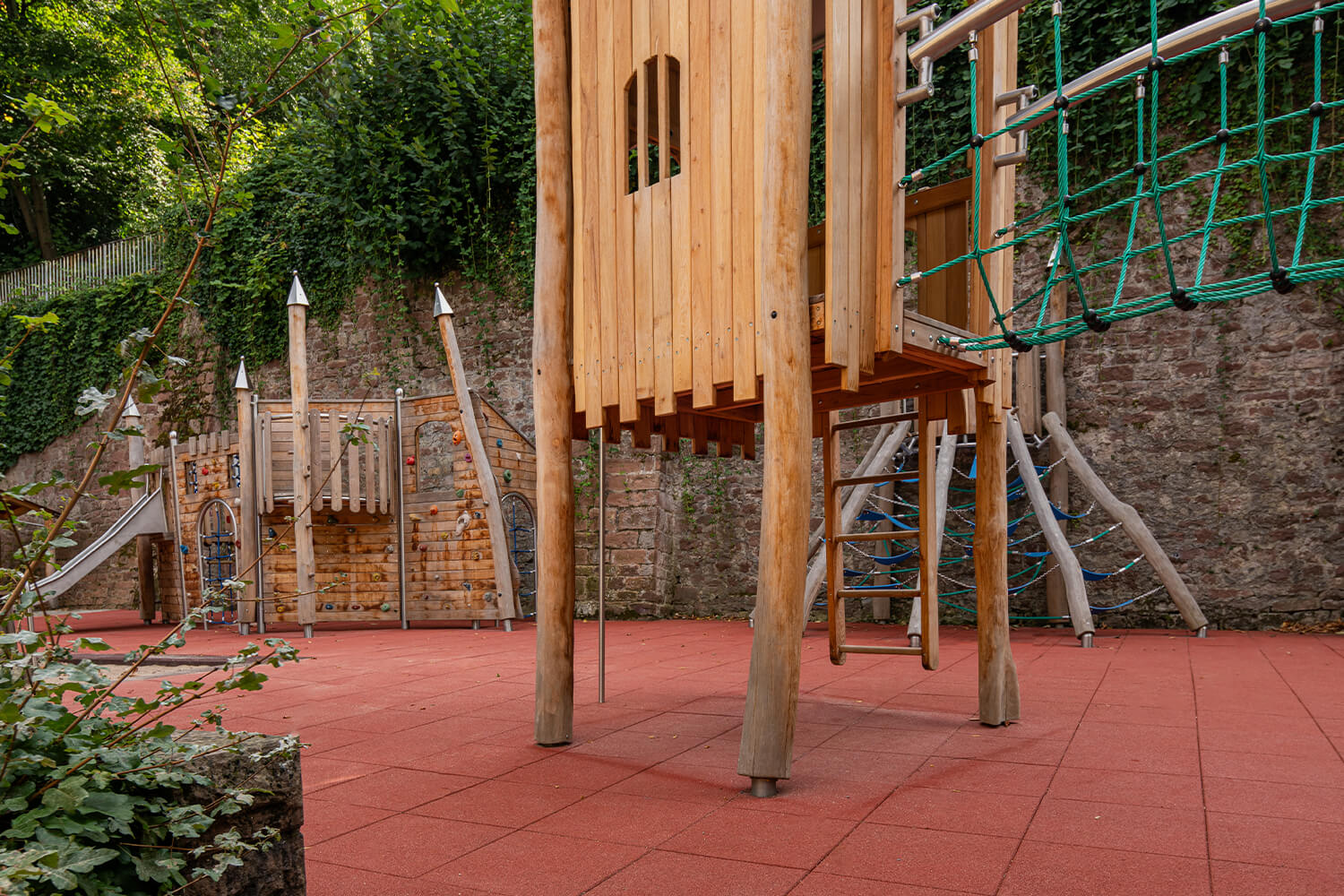For this project, REGUPOL delivered a total of 315 m² of REGUPOL playfix FX safety tiles in red. The tiles, tested according to DIN EN 1177, were delivered in two different thicknesses to meet the various requirements of the playground: 110 mm thick tiles (for fall heights up to 3 meters) for areas where higher fall heights are expected, and 75 mm thick tiles (for fall heights up to 2.10 meters) for areas where children play closer to the ground. Especially for active children who love to climb and jump, these safety tiles are essential. They ensure that any falls are cushioned gently, reducing the risk of injury. This way, children can continue to reach great heights and fully immerse themselves in play. Alongside functional safety, the bold red of the tiles adds a visual highlight. Colours play a vital role in child development, helping to stimulate imagination and creativity. The vibrant red fits perfectly with the overall look of the playground, creating a cheerful and inviting atmosphere for play and exploration.