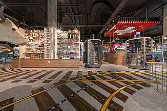 The floor design in the Top of Europe shop is a visual highlight: An airbrush artist sprayed rails onto our grey floor covering. The challenge was to find a compatible and durable colour.